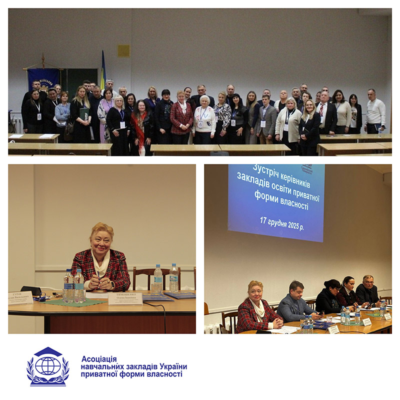 Асоціація навчальних закладів України приватної форми власності 17 грудня 2025 року провела своє щорічне засідання, яке відбулося у м.Києві на базі Європейського університету. У заході взяли участь приватні заклади вищої освіти з багатьох міст України: Києва, Бучі, Дніпра, Миколаєва, Хмельницького, Ужгорода, Чернівців, та ін.